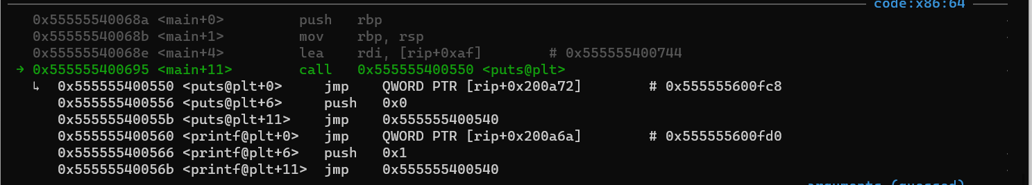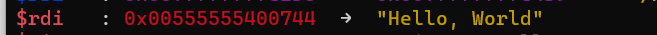 rdi레지스터에는 0x555555400744라는 주소가 들어있었고, x/s 0x555555400744명령어로 이 주소에 있는 데이터 값을 문자열 형태로 조회했다. 그러자 역시 예상했던 puts 함수의 인자인 "Hello, World"가 들어있었다.