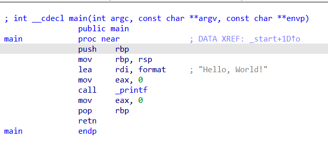 3행 : rdi에 format의 주소값을 넣는다. 여기서 format은 "Hello, World!"라는 문자열일것이다. (lea는 format의 주소값을 rdi에 저장하므로, format은 주소값이 아닌 문자열이다.)