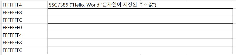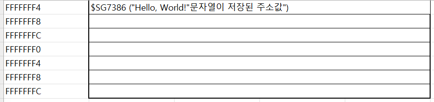 현재 스택은 이런 상태인데, (좀 잘못되긴 했고, 주소값은 임의로 했지만 일단 넘어가자) 스택의 최상단을 가리키는 레지스터의 값에 4를 더해주어(x64는 8을 더해준다) esp레지스터가 가리키는 값을 FFFFFFF8로 바꾼다. 이를 통해 필요 없어진 $SG7386의 값을 스택에서 빼내준다.