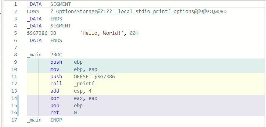 7~8행 : "Hello World\n"과 마찬가지로 뒤에 추가로 0aH가 붙었다. $SG7387은 "I like C Language"의 임시 이름이다.