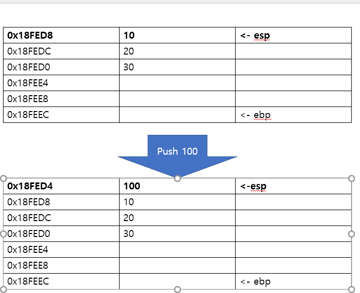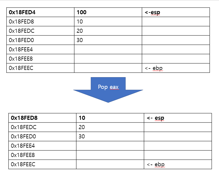 <표1>의 상태에서 pop eax 명령어를 실행하면, esp가 가리키는 메모리 (스택 가장 위의 메모리)0x18FED8의 값 100을 가져와 eax레지스터에 저장한다. 그 후 ESP/RSP에 4를 더하여서 esp는 0x18FED8을 가리키게 되고 100이라는 값은 스택에서 사라지게 된다.