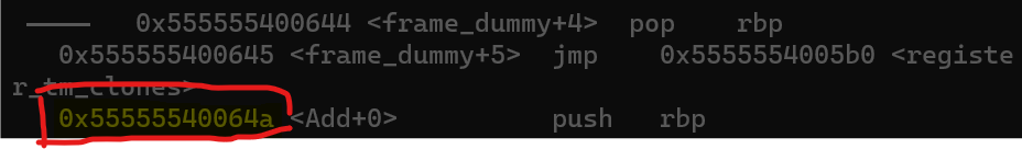 0x000055555540067c(함수의 리턴 주소)가 스택에 저장된다. 이후 call 명령어의 오퍼렌드인 0x55555540064a로 JMP해서